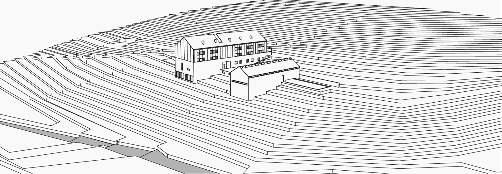 Hlavní objekt A tvoří kamenný sokl s odlehčenou dřevěnou nadstavbou. Objekt přístavku B je chápán jako kamenný monoblok s minimem otvorů (převážně ve střešním plášti). Oba dva objekty jsou propojeny podzemními prostory - objekt C.