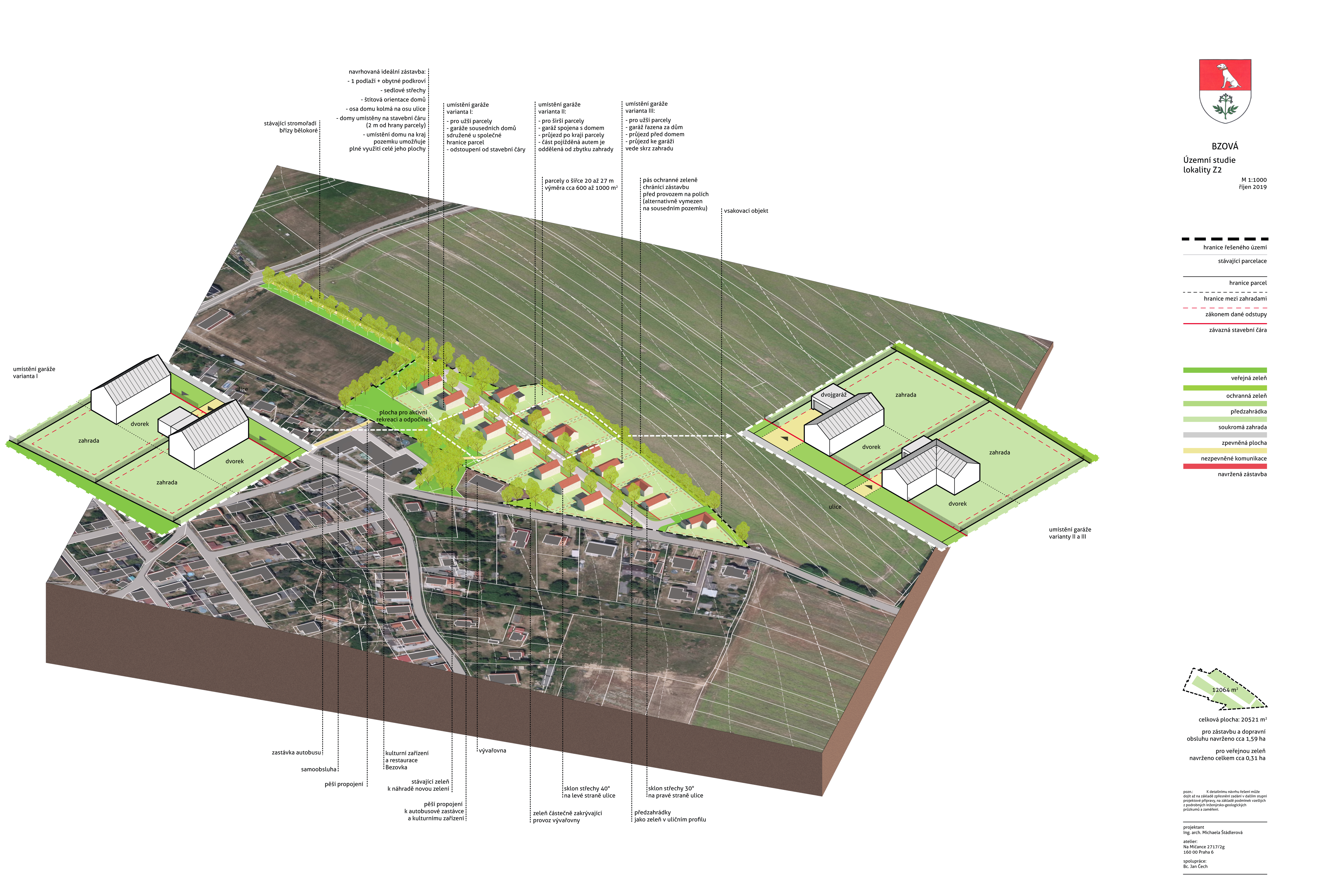 Ve studii jsou určena pravidla pro umisťování jednotlivých staveb s preferenci opakovaného a pravidelného umisťování hmot domů vůči parcele a dříve povolené komunikaci. Cílem je vytvořit dvě fronty domů, které drží jednotnou linii zástavby blíže ke komunikaci a jednotnou výškovou hladinu vždy v rámci fronty domů. Je navržena veřejná zeleň a propojka pro pěší směřovaná občanské vybavenosti a zastávce BUS.