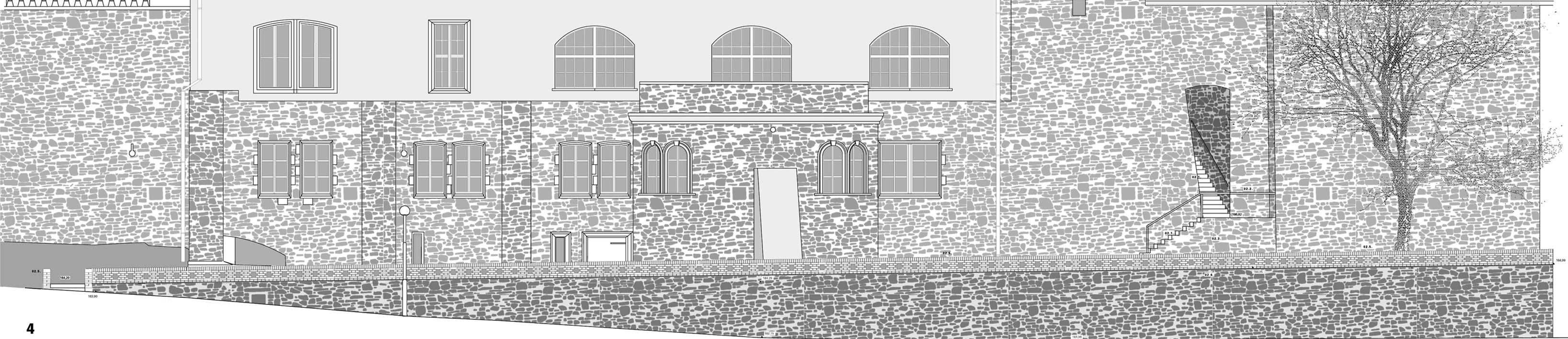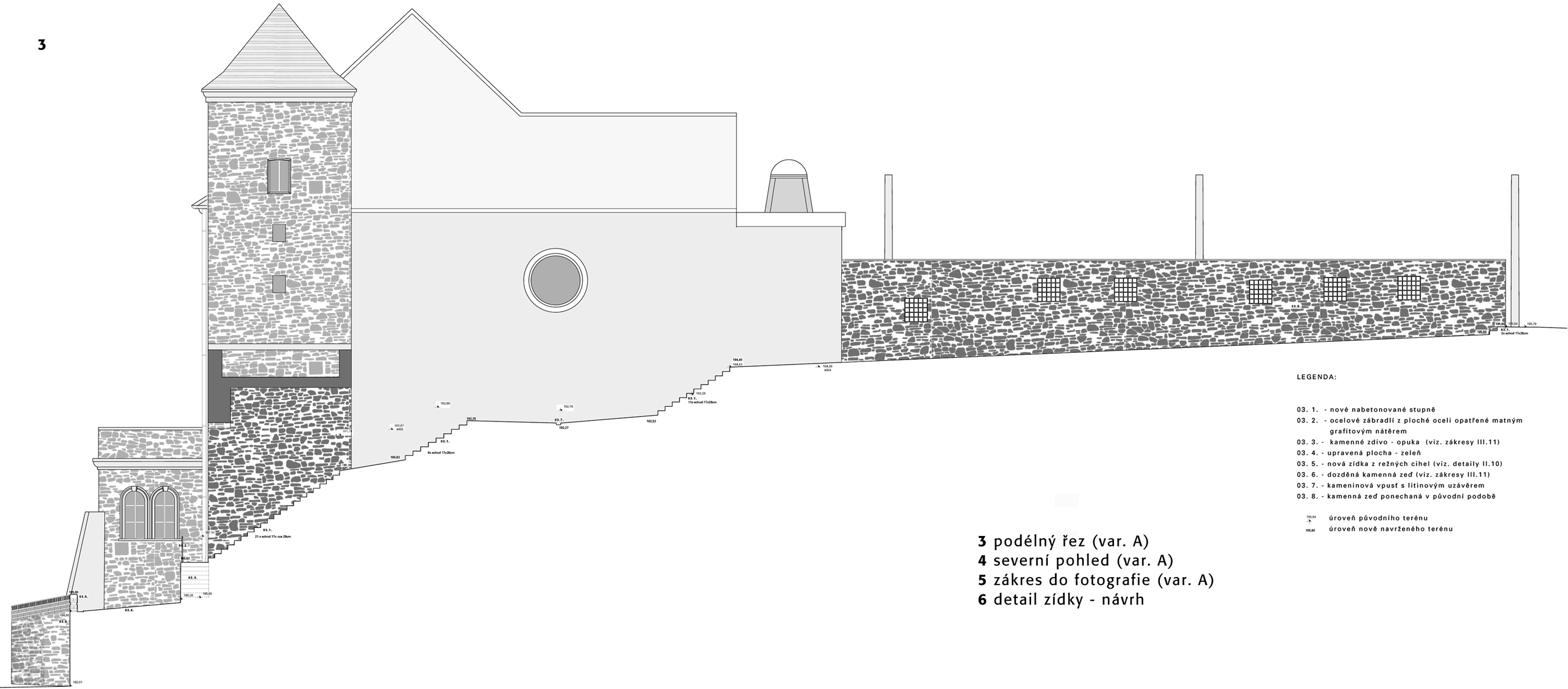 V souvislosti s přístupem na zvýšený hradební pás v ulici Pod šancemi je navržena úprava opěrné kamenné zdi a její ukončení profilovanou zídkou z režných cihel. Podél privátního pozemku je jako dělící prvek navržen kamenný sokl s odlehčenou podpůrnou konstrukcí pro popínavé rostliny vysázené na privátní straně pozemku. Stěna je směrem k Pivovarské ulici ukončena stávajícím sloupkem oplocení, na straně opačné nedoléhá až k objektu, mezeru vyplňují dvířka umožňující vstup na privátní pozemek přímo z uličky.